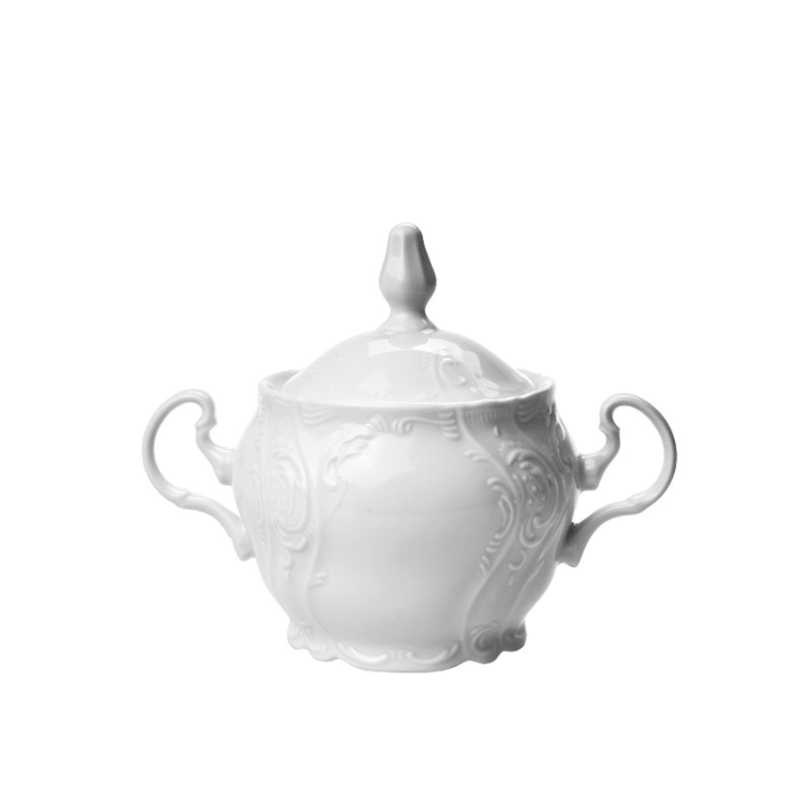 Bernadotte - porcelánová cukornička v bielom prevedení, okraj a obvod zdobený čipkovaným reliéfom.
