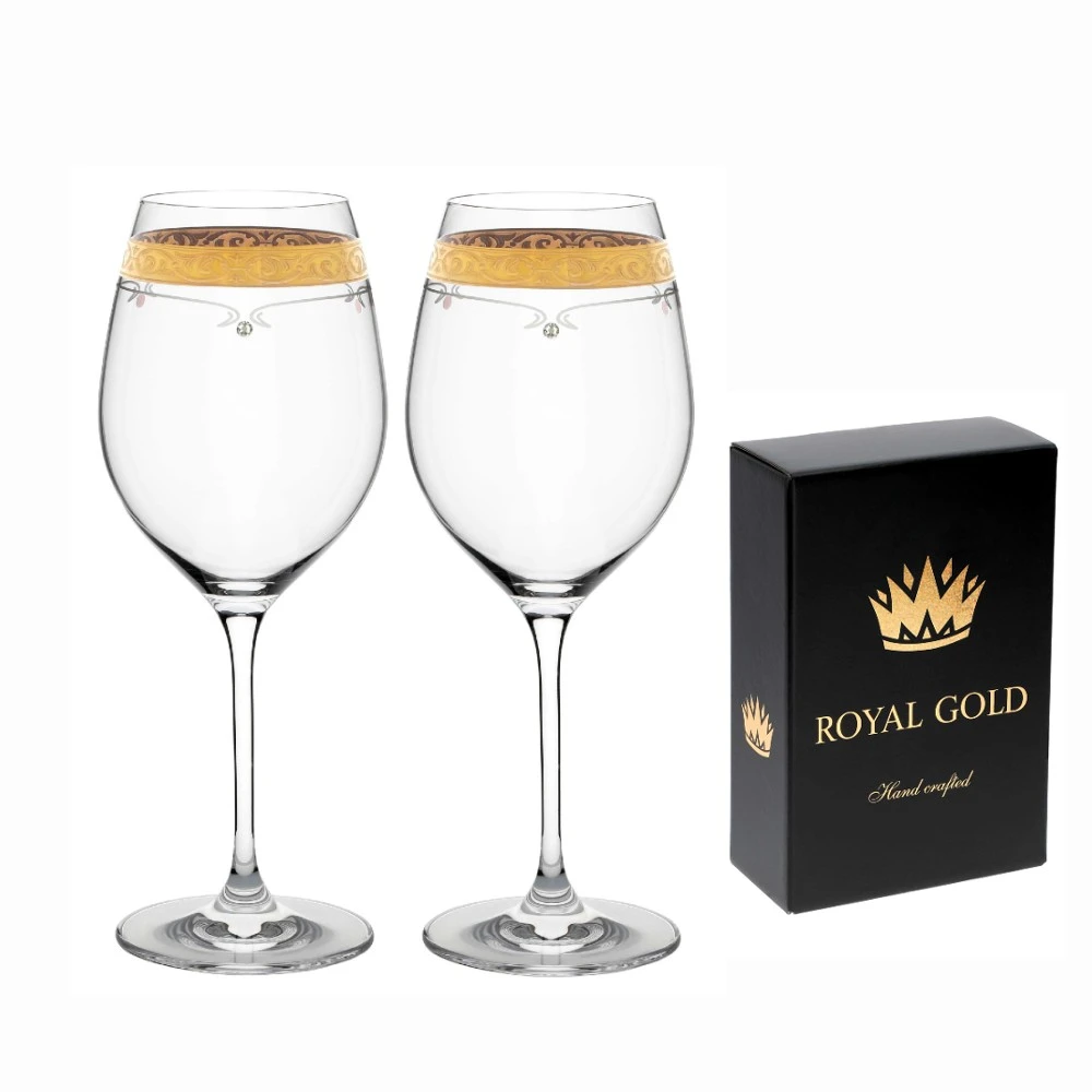 Poháre na víno Gold Crystals - ide o exkluzívnu edíciu výrobkov ROYAL GOLD vyrobených z kvalitného krištalínového skla s 24 karátovým zlatom. Dekor je doplnený o kryštály. Každý pohár je ručne dekorovaný.
