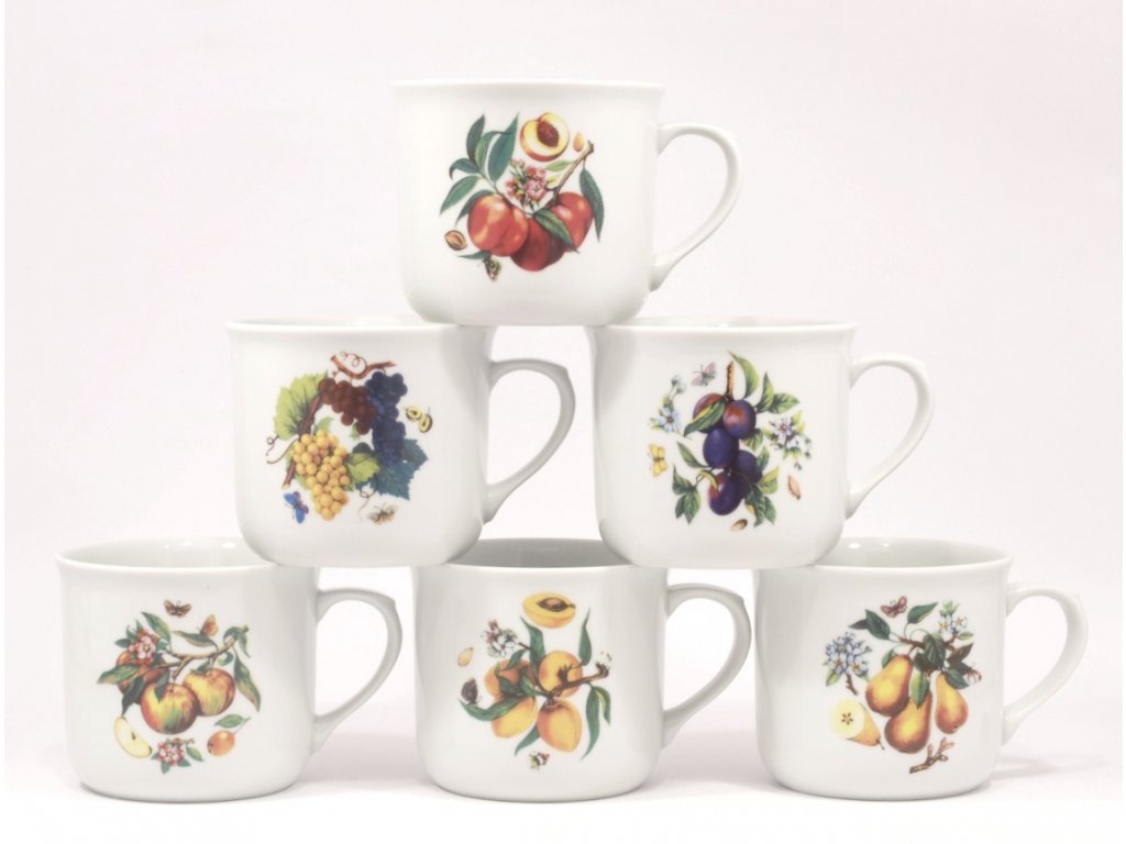 Porcelánový veľký hrnček s dekorom s ovocným motívom - mix druhov - hrozno, marhule, slivky. Kvalitný Karlovarský porcelán.