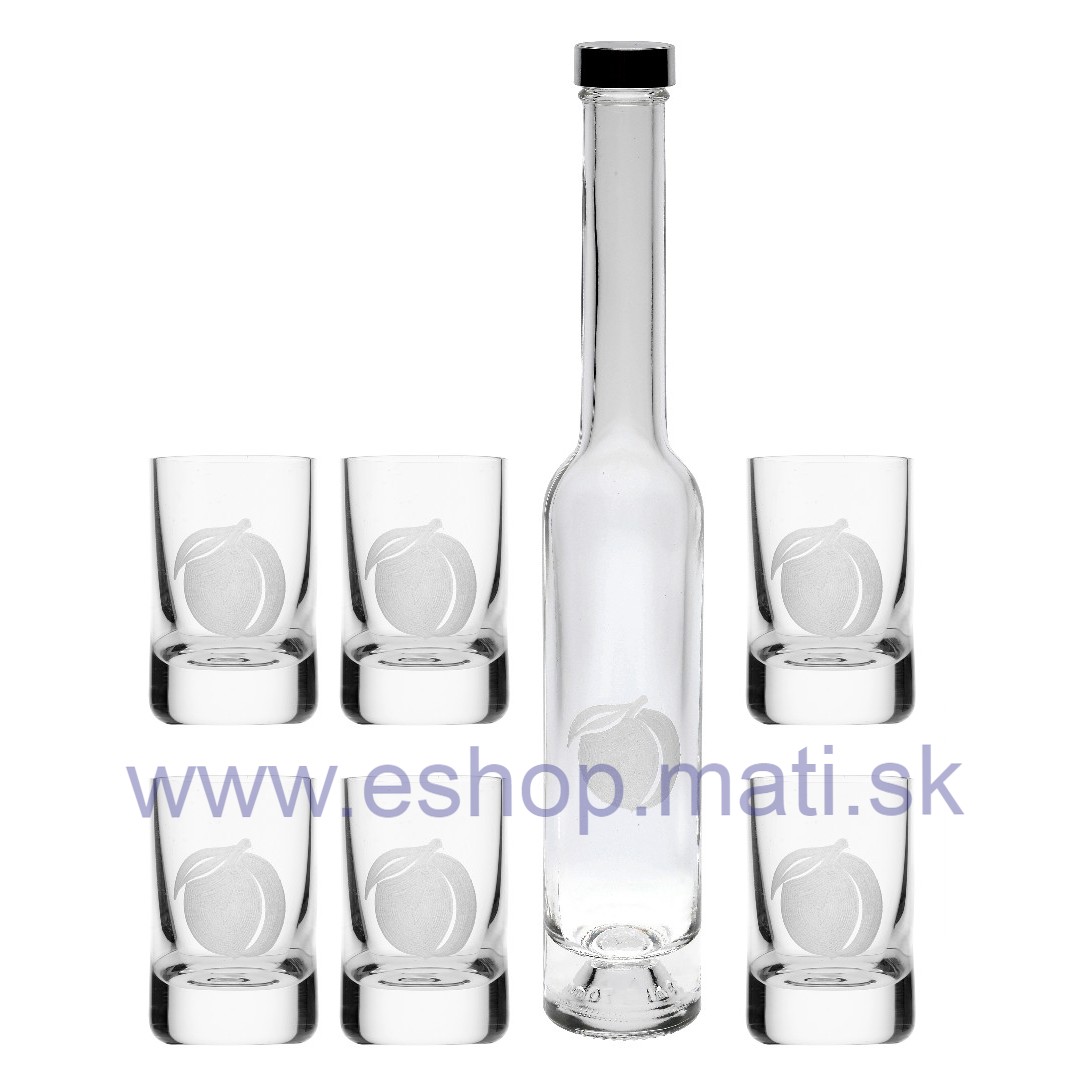 SET fľaša (1ks) Platina 200ml + poháre Spirit 30ml (6ks) s dekorom APRICOT/MARHULA - sú kvalitné slovenské výrobky, ktoré svojím tvarom a prevedením potešia každého milovníka ovocných destilátov. Na rozdiel od hrubého zatavenia umožňuje vyššie hygienické nároky a dodáva poháru profesionálny vzhľad. Vysoká kvalita skla zaručuje trvalú brilanciu a transparentnosť. Set je vhodný aj do umývačky riadu. Dodávame v darčekovej krabici.
