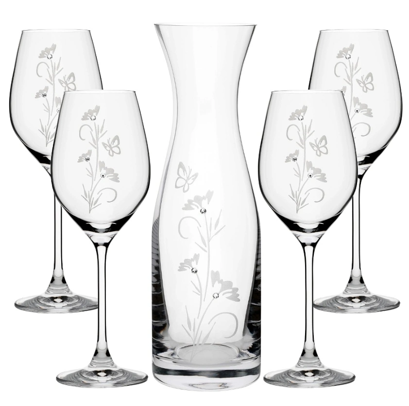 Vysokokvalitné sklo zaručuje trvalý lesk a priehľadnosť bez mliečneho povlaku. Krásny a decentný vzhľad podčiarkuje dekor Flower, KVET obohatený o kryštály. Každý pohár je ručne zdobený. Karafa slúži na elegatné podávanie vína ale môžete ju využiť aj na servírovanie limonád, prípadne ako okrásná váza - fantázii sa medze nekladú.