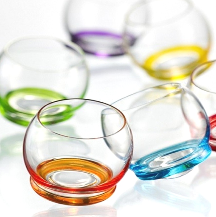 Každý pohár má spodný okraj farbený - zaručene si ich vaši hostia nepomýlia. Farby: žltá, zelená, oranžová, modrá, červená, fialová.