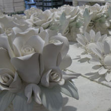- Kvety sú upevnené na kmene, vázy a košíky spolu s lístkami a listami. Veľký pozor je kladený na všetky detaily, dokonca aj na porcelánové ruže s malími tŕňami. Nakoniec sa pristúpy k sušeniu, ktorý závisí od veľkosti výrobku. Sušia sa prirodzene, alebo v miestnostiach na sušenie.