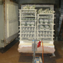 - Výrobky sú skontrolované jeden po druhom, potom sú umiestnené na špeciálne podnosy a vypálené v peci pri 1300°C: proces vypalovania trvá približne 18 hodín a porcelán sa pritom scvrkne asi o 20%. Súčasne sa porcelán staví dokopy a výsledkom je jediný kus, veľmi vysokej tvrdosti a s transparetnou bielou farbou.
